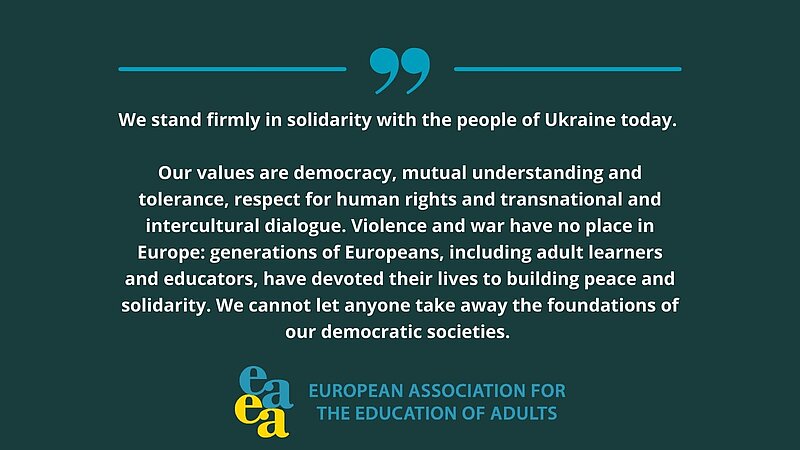 «Сьогодні ми повністю солідарні з народом України. Європейська асоціація освіти дорослих (EAEA) популяризує неформальне навчання та освіту дорослих з 1953 року задля сприяння миру, демократії та солідарності. Освіта дорослих є трансформаційною та обʼєднуючою для окремих людей, громад і суспільства. Наші цінності – це демократія, взаєморозуміння та толерантність, повага до прав людини, транснаціональний та міжкультурний діалог.