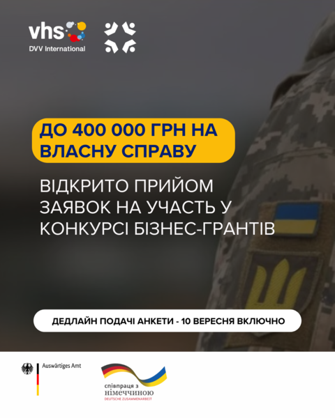 DVV International в Україні оголошує конкурс для ветеранів та ветеранок, членів їхніх сімей на надання підтримки на відкриття чи розширення власної справи.