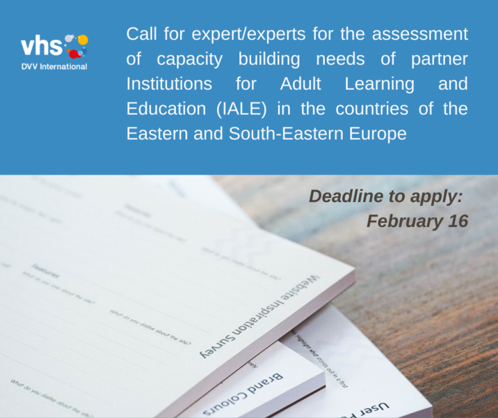 DVV International is looking for an expert or experts for capacity building needs assessment of partner Institutions for Adult Learning and Education (IALE) in the countries of the Eastern and South-Eastern Europe. Between 12-15 institutions of Adult Learning and Education from the countries of the region had been selected to participate in the capacity building needs assessment. The objective of the assignment is to implement the needs assessment and write the report, which should include prioritised recommendations on targeting the identified need in competencies. Read the Term of Reference with the detailed information.